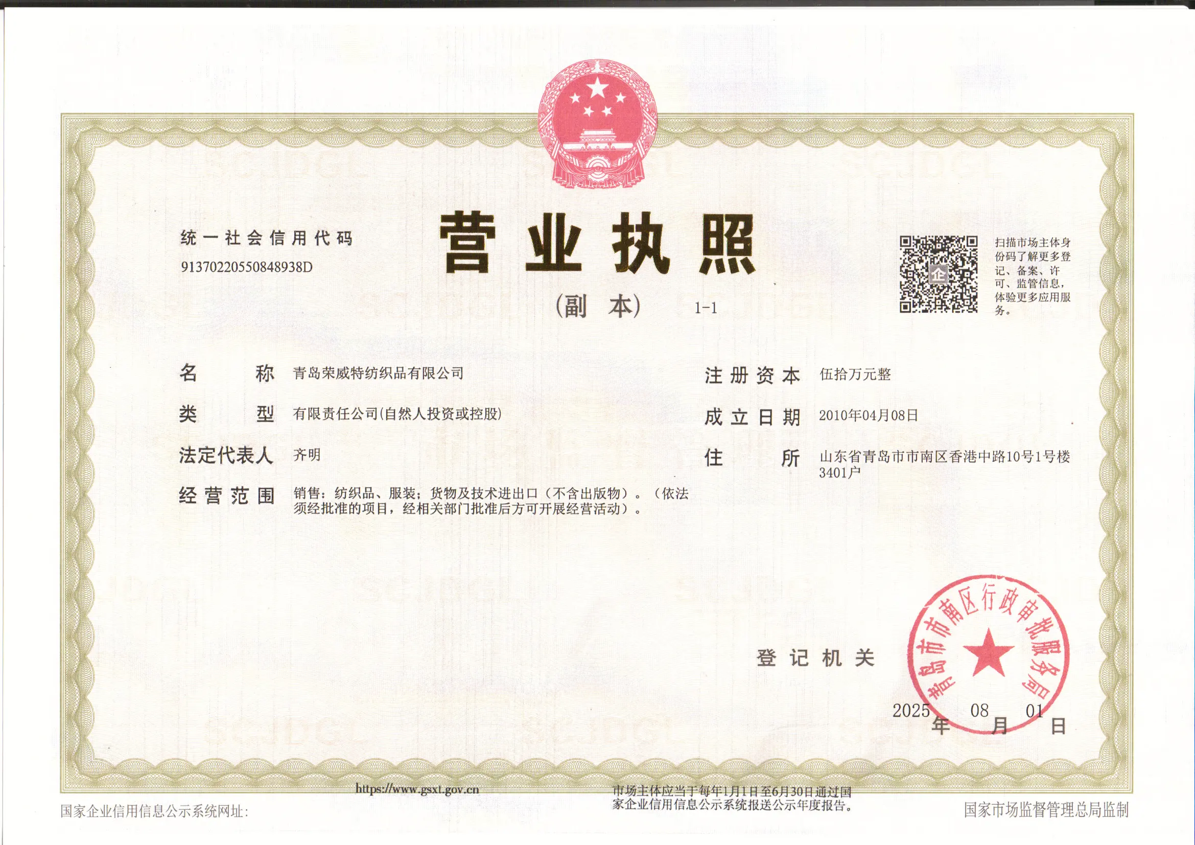 Registered address : Room 3401, Building 1, No. 10 Xianggang Middle Road Qingdao Shandong China